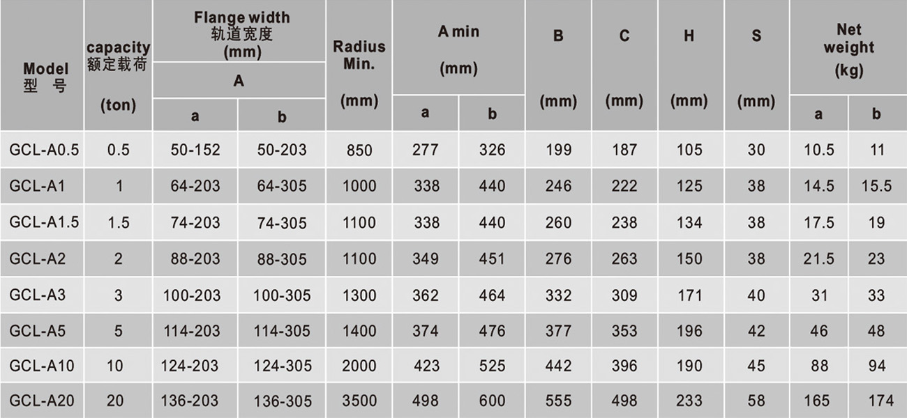 山東五牛GCL-A型 手拉單軌小車(chē)指標(biāo)參數(shù):