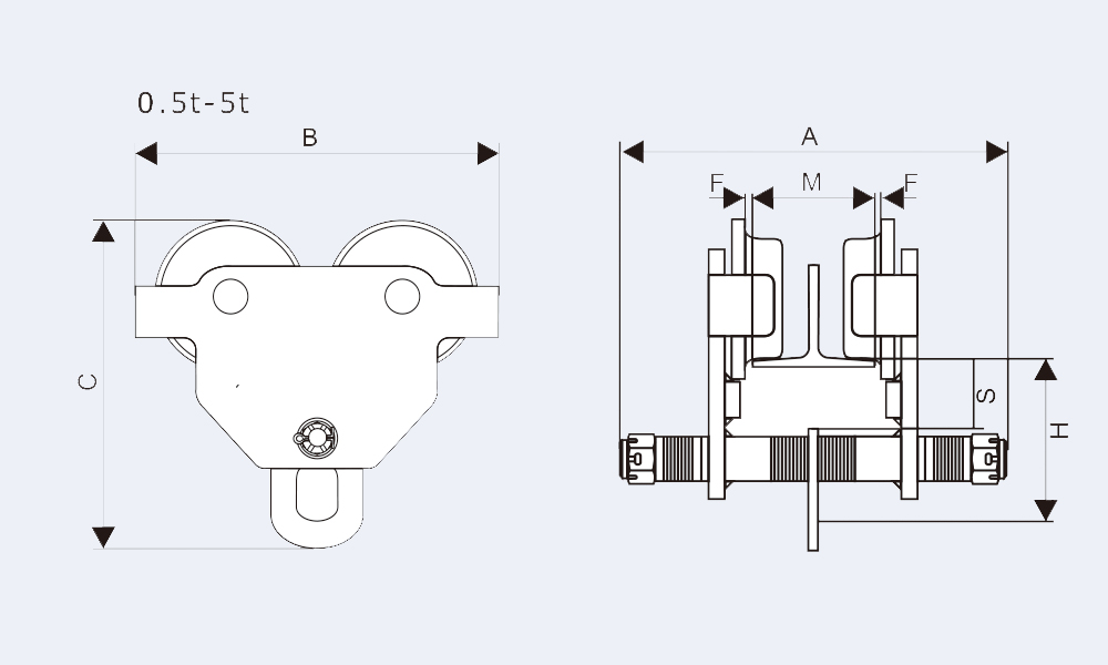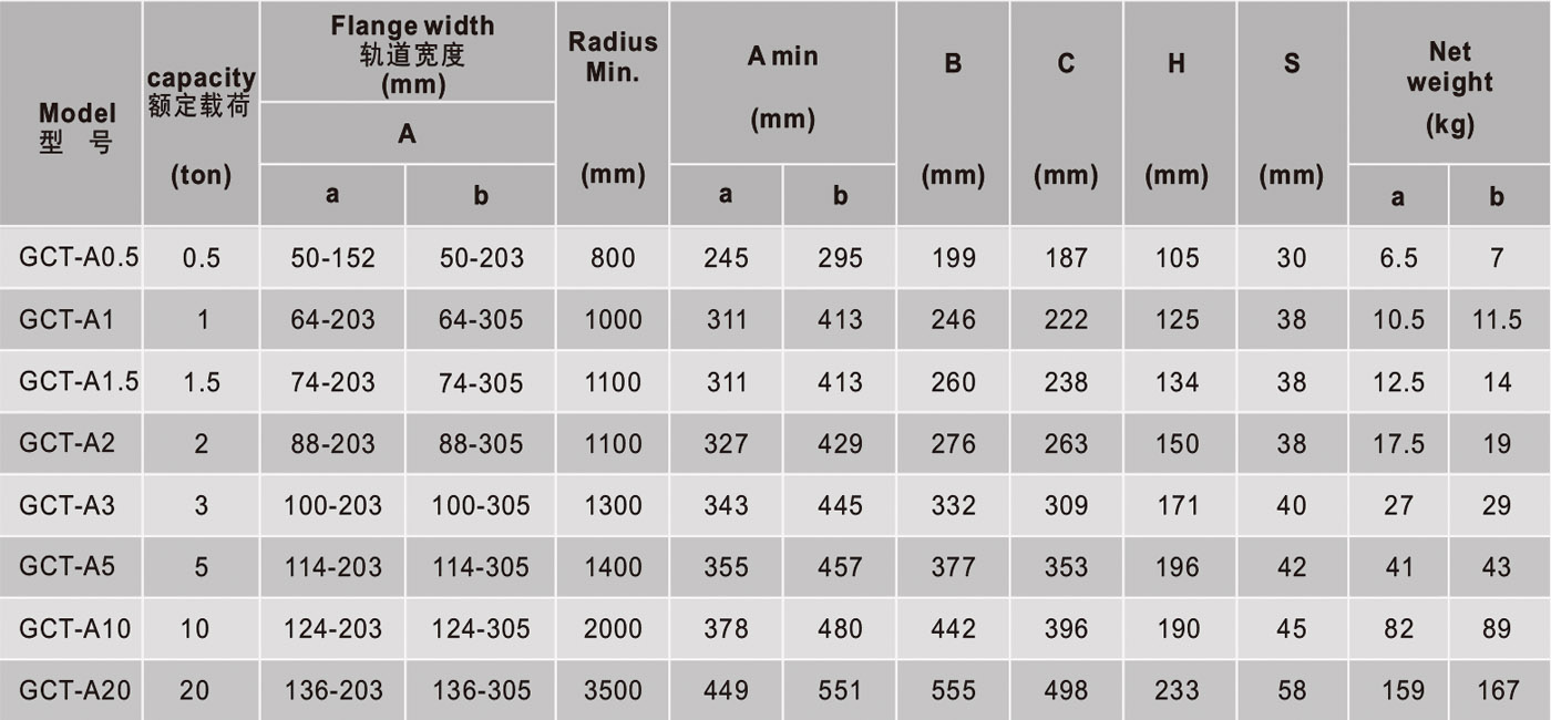 山東五牛GCT-A 手推單軌小車指標參數(shù)圖:
